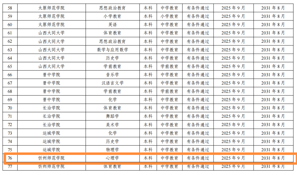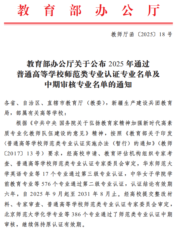 2025年9月23日,教育部办公厅正式发布《关于公布2025年通过普通高等学校师范类专业认证专业名单及中期审核专业名单的通知》(教师厅函〔2025〕18号),我系心理学专业顺利通过师范类专业第二级认证,认证结论有效期六年(2025年9月至2031年8月)。