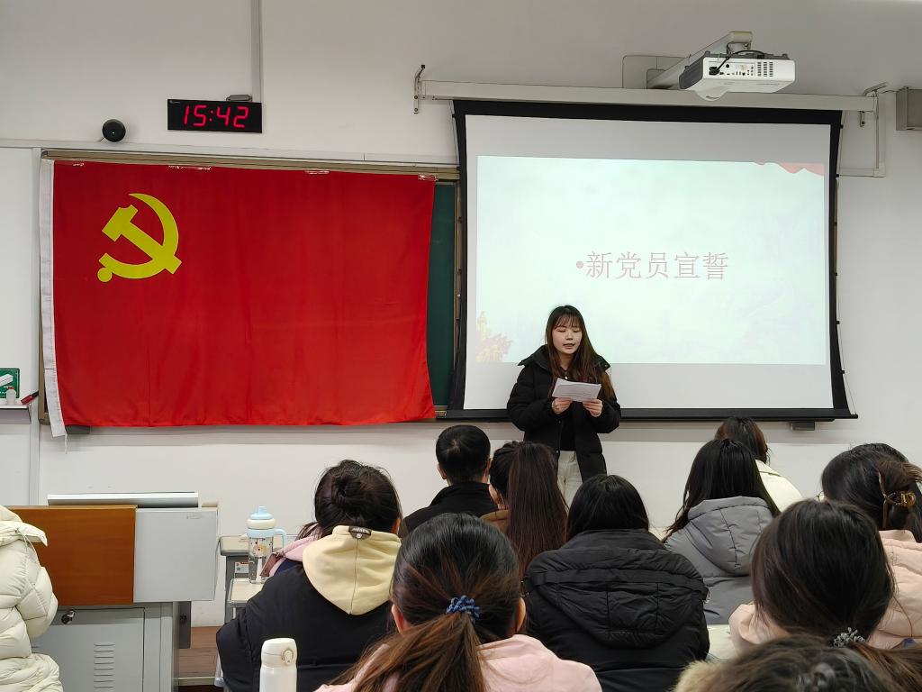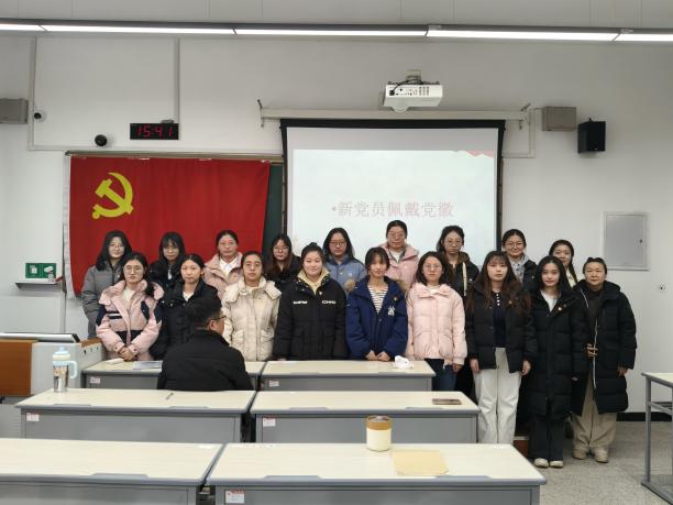 仪式在庄严的《国歌》声中拉开帷幕。组织员张志珍同志首先宣读了校党委吸收预备党员的批复,支部书记为新发展党员依次佩戴党徽,以崭新的身份迎接宣誓时刻。随后,全体人员起立,预备党员面向党旗在李杰同志的领誓下,齐声宣读入党誓词,铮铮誓言彰显着新党员们对党的忠诚与担当。